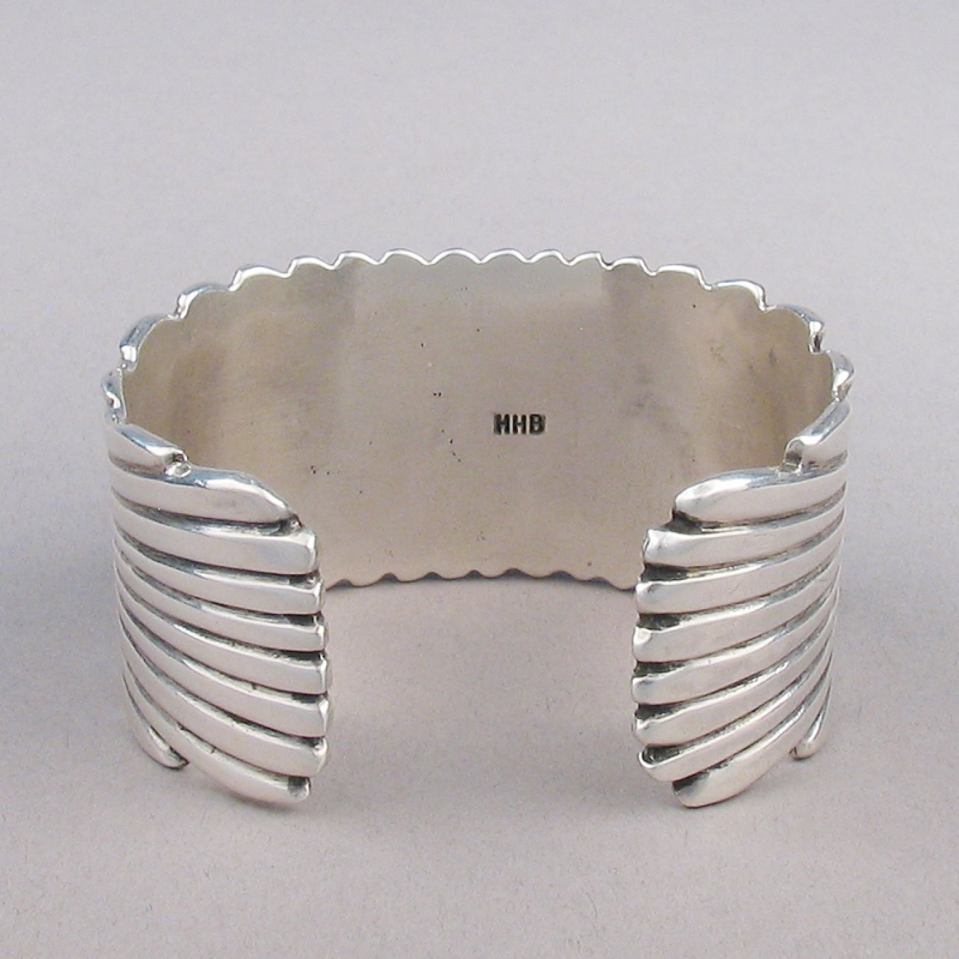 A Navajo ingot silver bracelet with sculptural file work and two rows of natural Lone Mountain Turquoise signed clearly on the interior HHB.