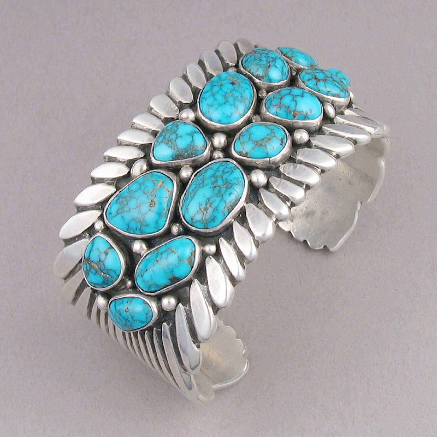Material: Sterling silver and 13 Lone Mountain turquoise cabochons