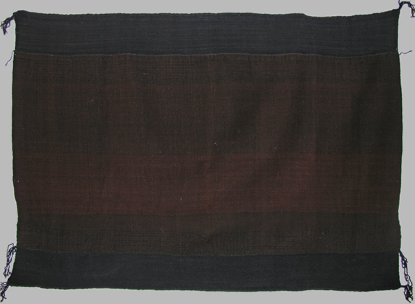 Handspun wool in natural brown, with aniline dyed red and green, indigo blue. This manta was woven by the Great-Great Granduncle of Karen Talashoma, Second Mesa.