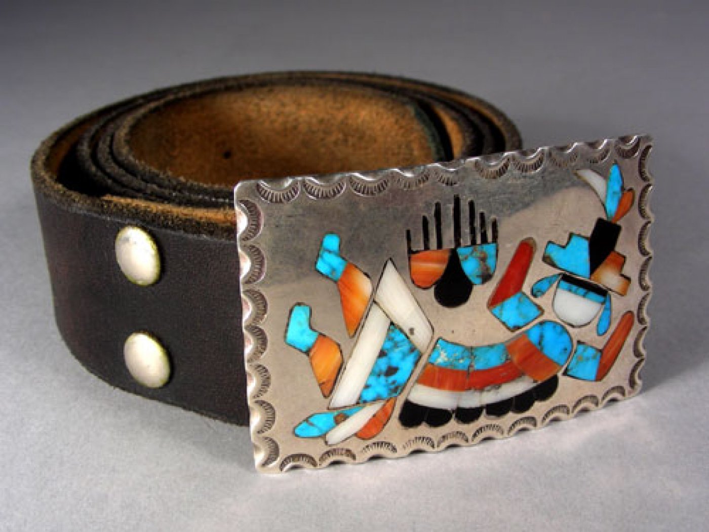Zuni Rainbow Man Inlay Belt Buckle, c 1950