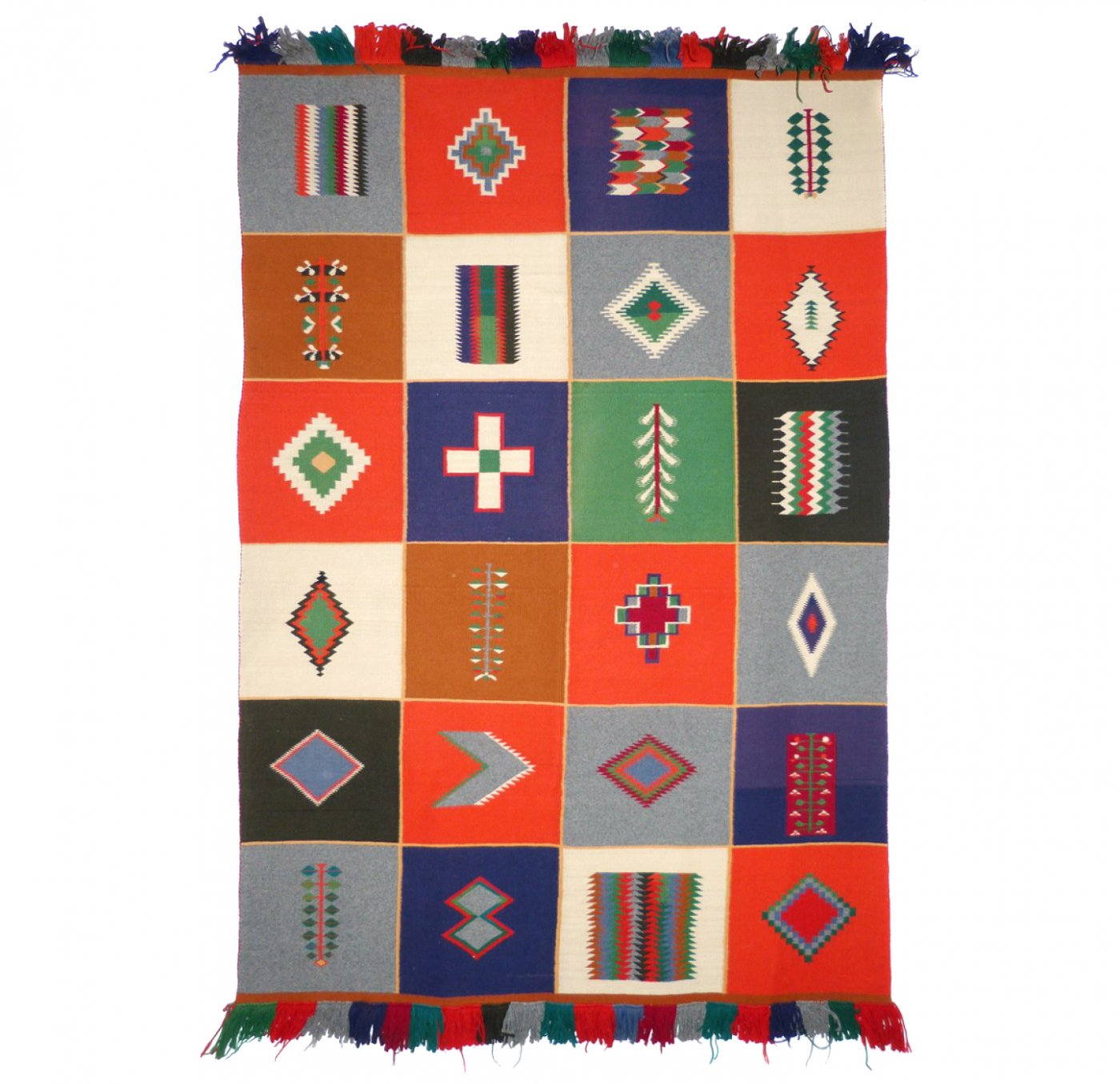 A Navajo weaver wove this outstanding blanket in the last quarter of the 19th century using commercially spun and dyed wool from Germantown, PA. (one of the first wool manufacturing companies in the United States before the turn of the century). The design is composed of twenty-four distinct squares, each with common Navajo designs, creating a sort of sampler pattern. The textile is in excellent original condition.