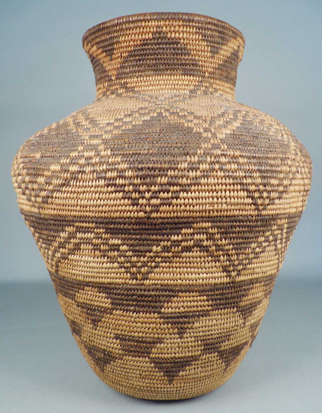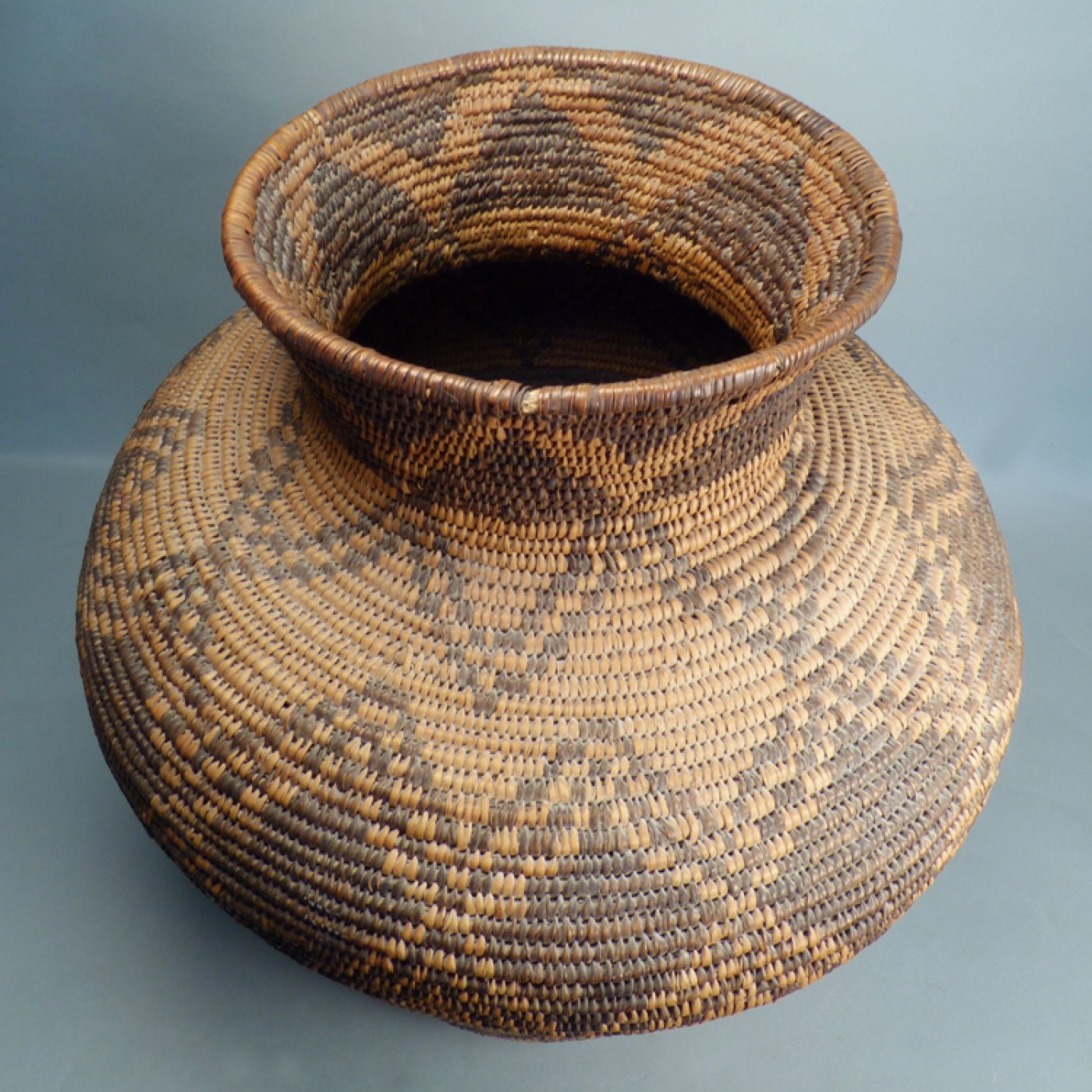 This is an early 20th century Apache basketry olla woven in willow and Martynia on a rod foundation. The design is composed of four horizontal bands of repeating geometric motifs all are variations of diamond forms.
