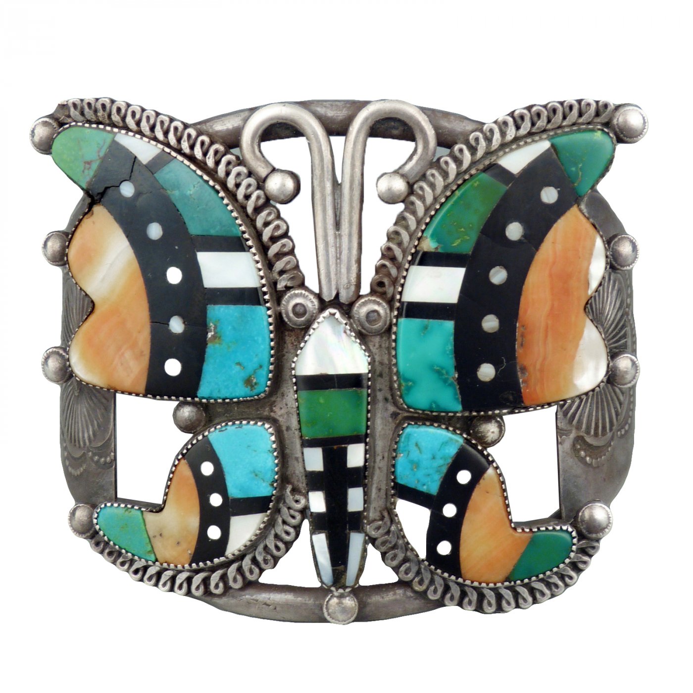 This is an early 20th century Zuni silver cuff style bracelet with inlay. The cuff is comprised of three split silver wires connected at each terminal with an overlay silver plaque decorated by a concho stamp on each side. At center the cuff features a large butterfly set with channel inlay in turquoise, mother of pearl, spiny oyster shell, and jet.