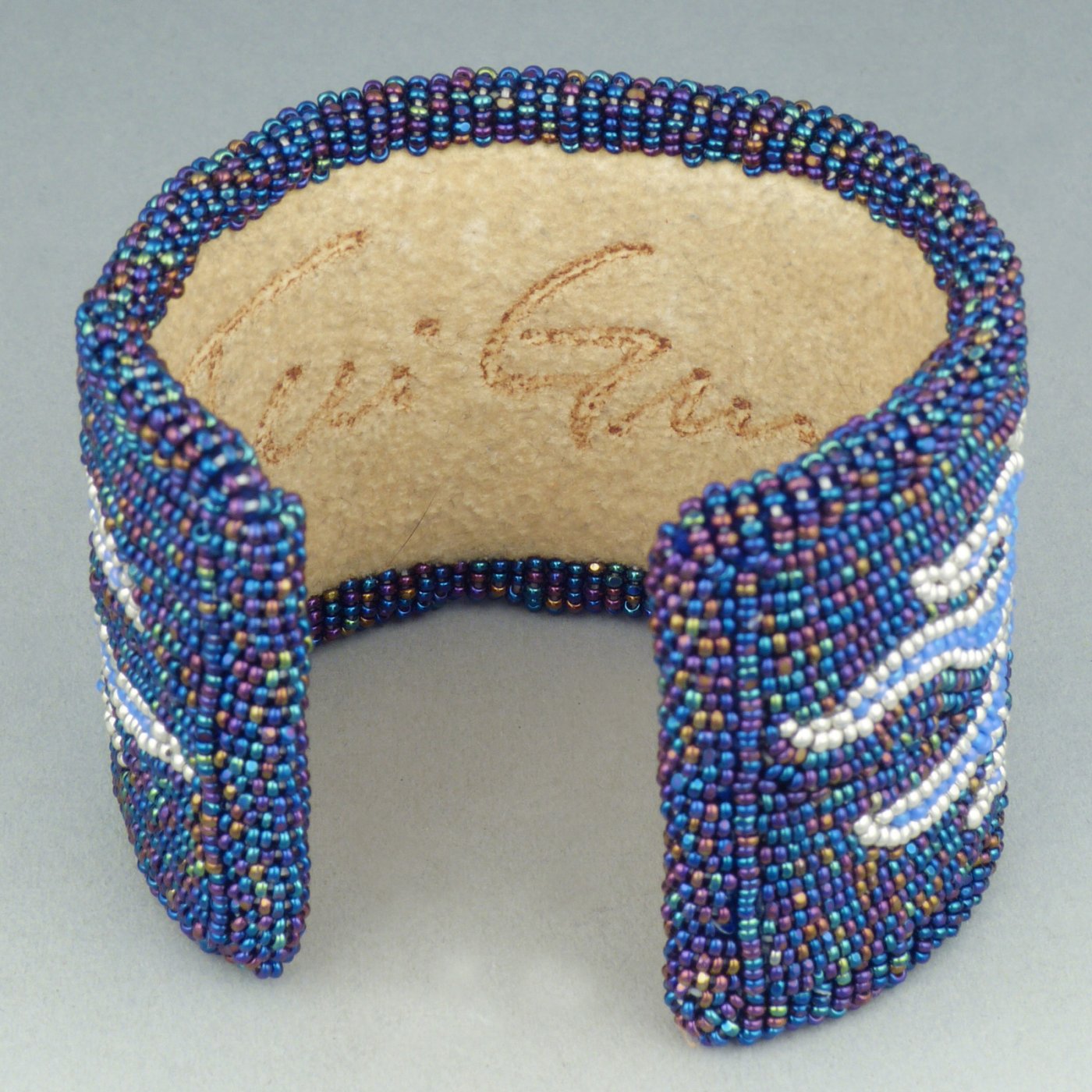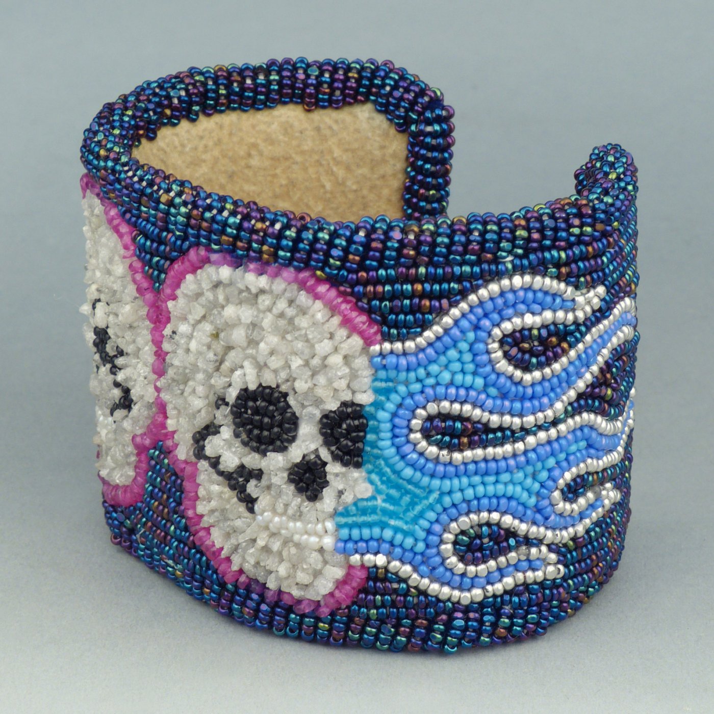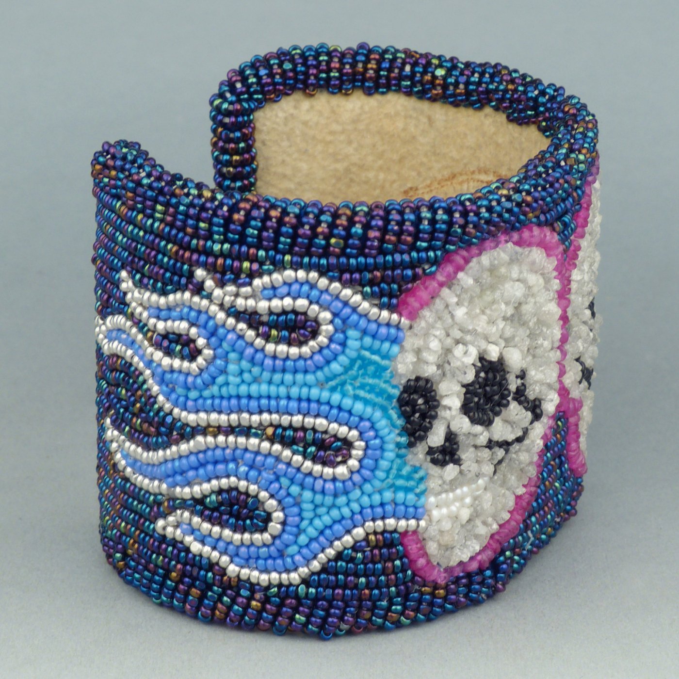 This is a contemporary fully beaded bracelet on smoke tanned hide with a copper interior cuff by Kiowa artist Teri Greeves. The design features mirrored skull with emanating blue flames on an iridescent background all done in glass beads save for the skulls that are done in raw diamonds. The bracelet is clearly signed on the interior.