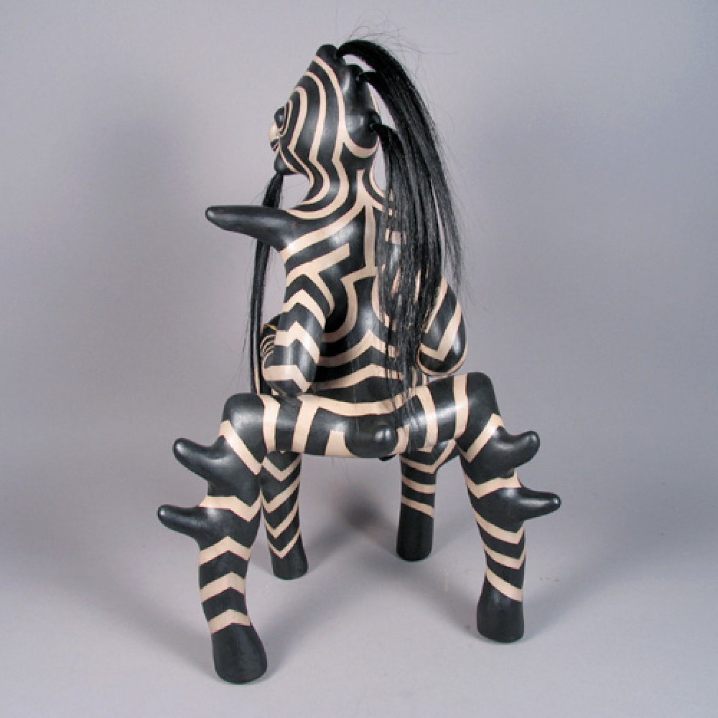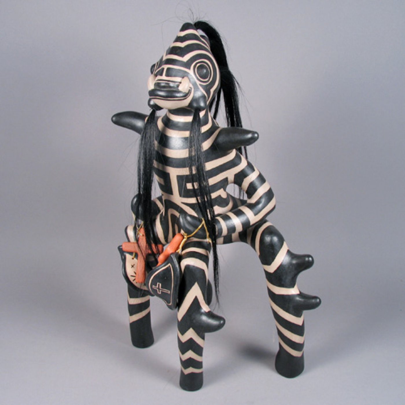 This is a contemporary ceramic sculpture titled "Tracker" by Cochiti Pueblo artist Virgil Ortiz. This piece was originally featured in an exhibit and sale titled "Revolt" in 2009 at Shiprock Santa Fe. The sculpture is made in native clay and paints and has an alien form with four legs, two arms and horn shaped protrusions at the shoulders and on the legs. Two long bundles of horse hair hang from the chin and sprout from the top of the head. The figure holds "trophies" of conquistador helmets and crosses in each hand. The piece is clearly signed and dated on the base.
