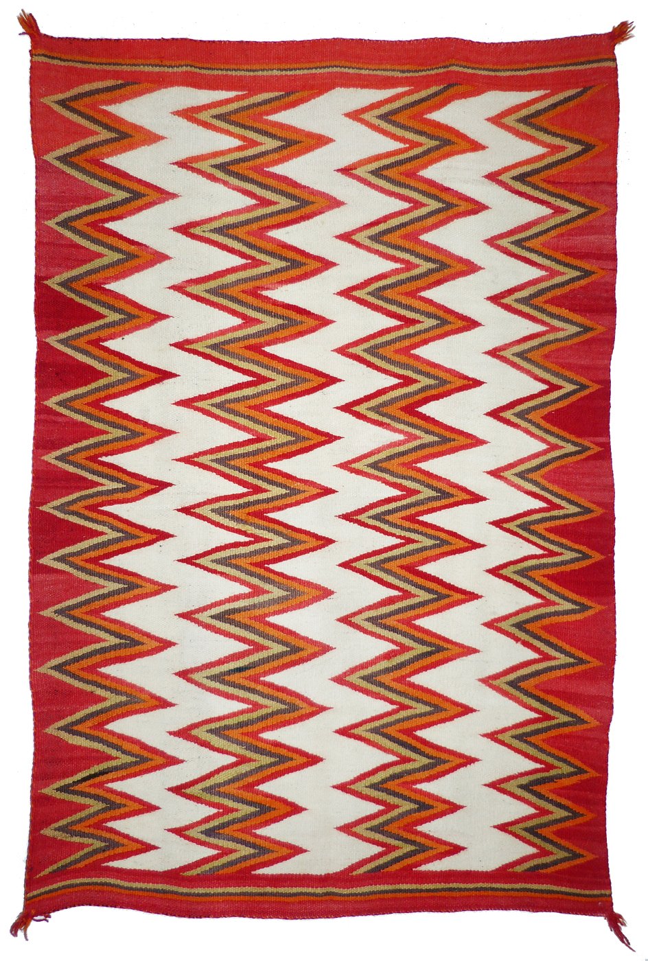 This is a late 19th century Navajo Transitional Period blanket hand woven entirely in native hand spun wool in natural ivory, dark brown, and hand dyed aniline orange and red. The design features four bands of vertical zig-zags in alternating colors, all on an ivory field and bordered in red. Two thin bands run horizontally across the top and bottom.