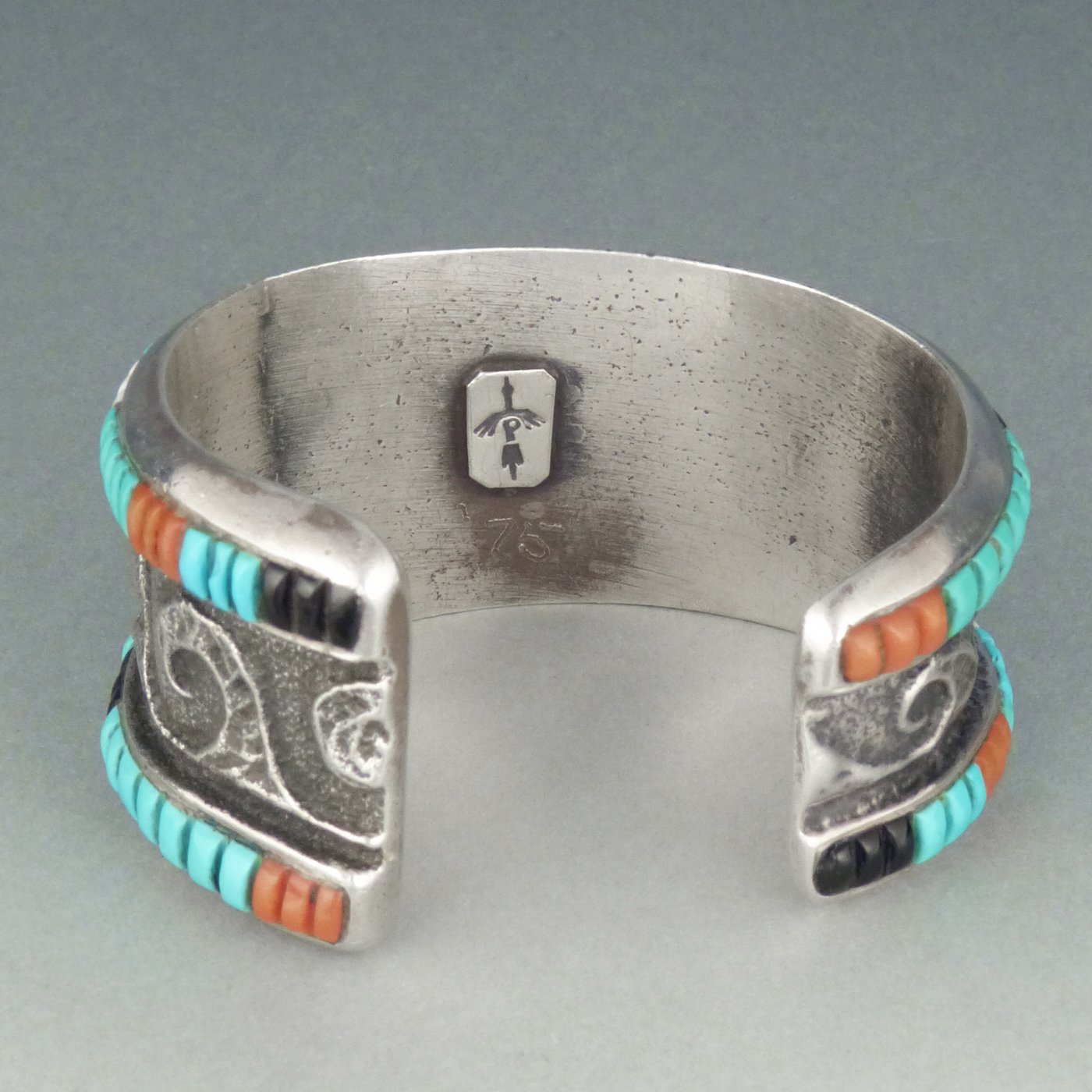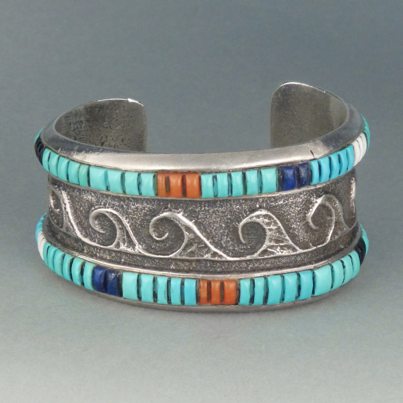 This is a modern Hopi tufa cast silver cuff with turquoise, coral, lapis lazuli, and shell. The cuff is slightly tapered with one side higher than the other. The center band features a repeating wave design raised above a tufa stone textured surface. Above and below the center band are bead style inlay channels of alternating "beads" of turquoise, coral, lapis, and shell. The bracelet is clearly hallmarked on the interior.