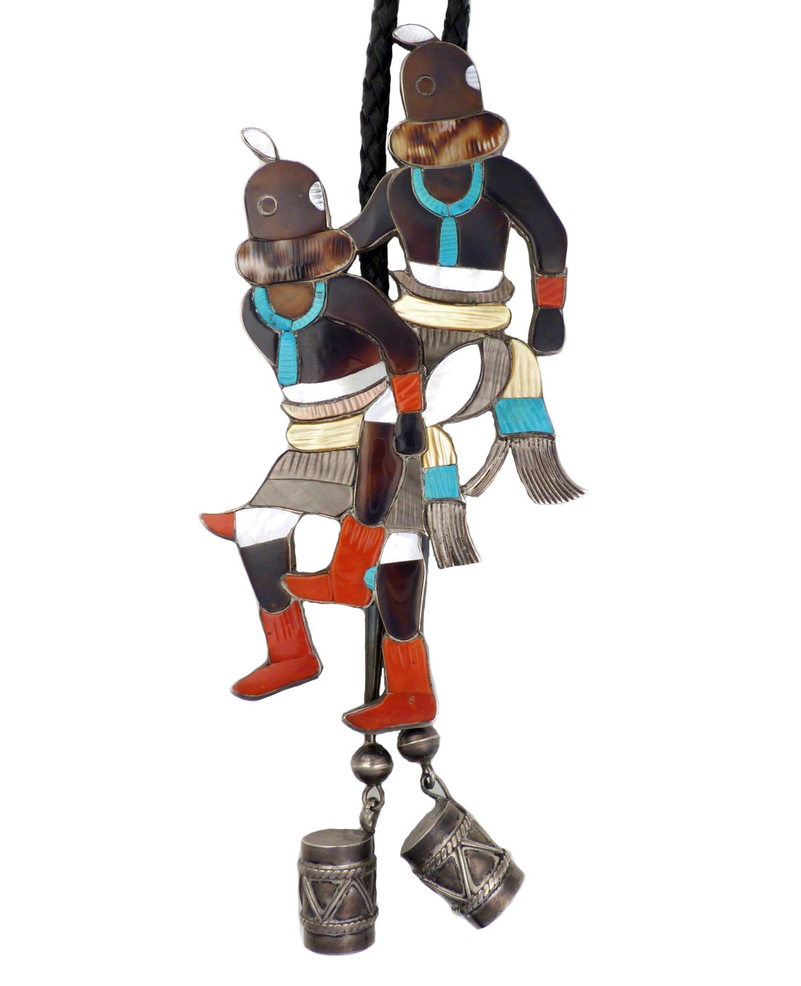 Eddie Beyuka, Zuni Mudhead Inlay Bolo Tie with Silver Drum Dangles