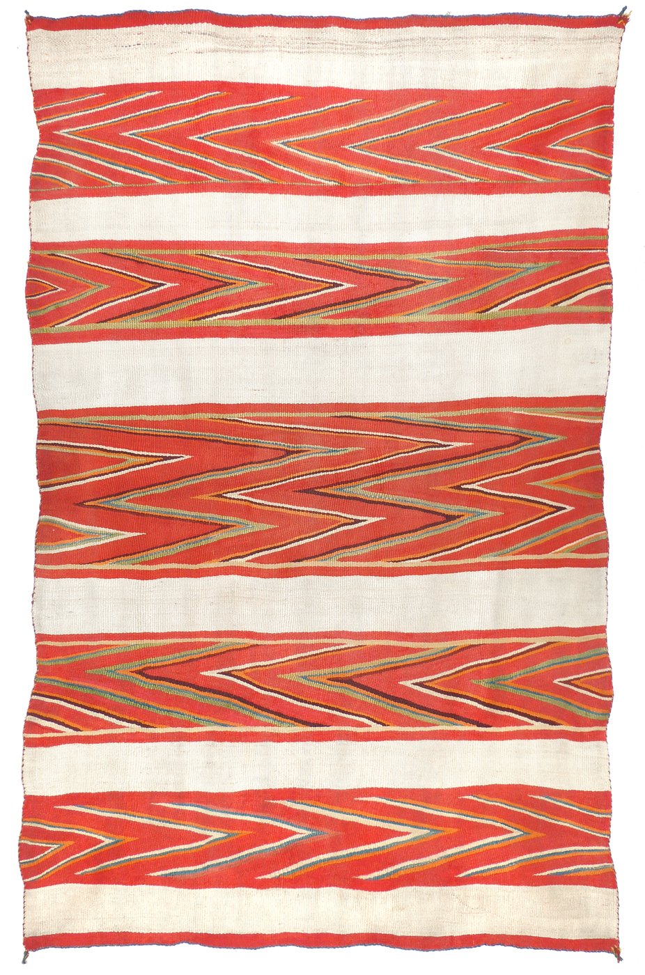 A late 19th century Navajo wedge weave textile woven in hand spun natural ivory and vegetal dyed indigo, raveled and re-carded reds and aniline dyed orange. The blanket features five broad horizontal bands of red with brightly colored zig-zag patterns on the interior, produced using a pulled warp technique known as wedge weave, all on an ivory background. The blanket is bordered by a thin band of red across top and bottom. Blankets woven using the wedge weave technique are rare, even for the period.