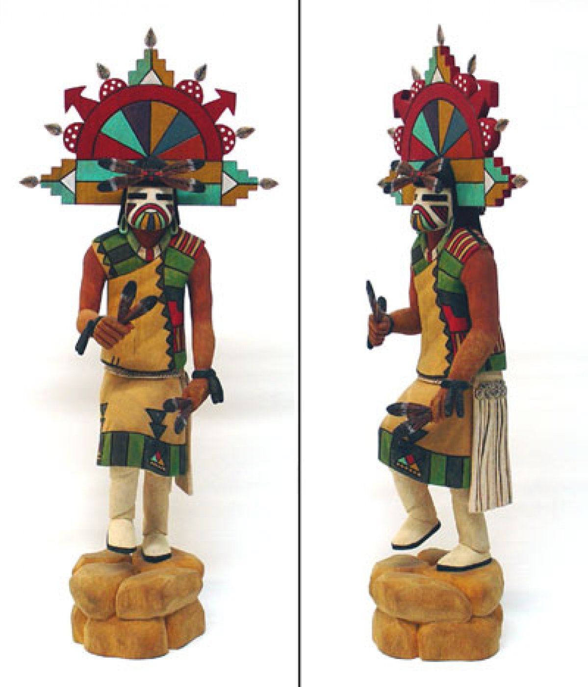 Water Drinking Girl or Butterfly Girl (Palhik\'Mana) is not a katsina but a woman dancer. It is one of the most beautifully decorated carvings. Jocelyn Honanie of Hopi is the artist. The figure is 12 1/2\" tall on a 2\" base.