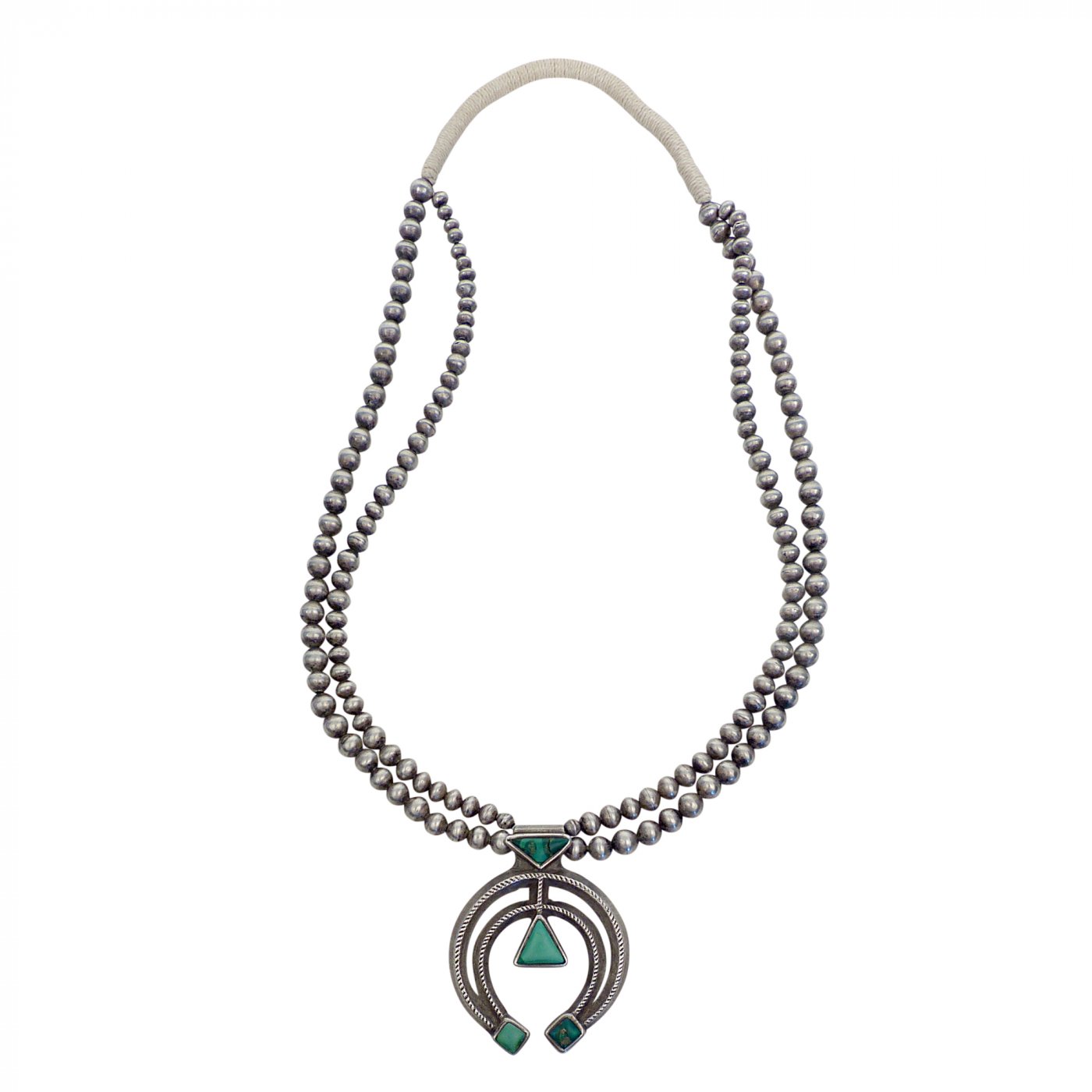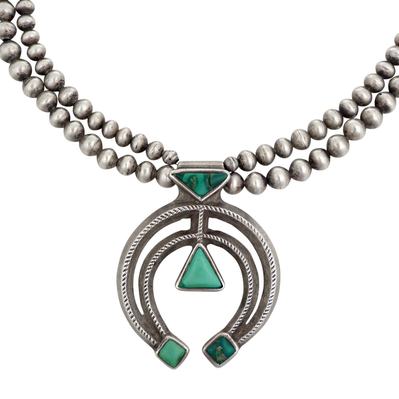 This is an early 20th century Navajo silver necklace comprised of two strands of handmade spherical silver beads finished with a traditional native wrap at the top. The necklace features a double silver wire crescent shaped naja pendant at center, decorated with repeating chiseled lines, a triangle shaped turquoise cabochon extending from the top and into the center, and a square shaped turquoise cabochons at each terminal.