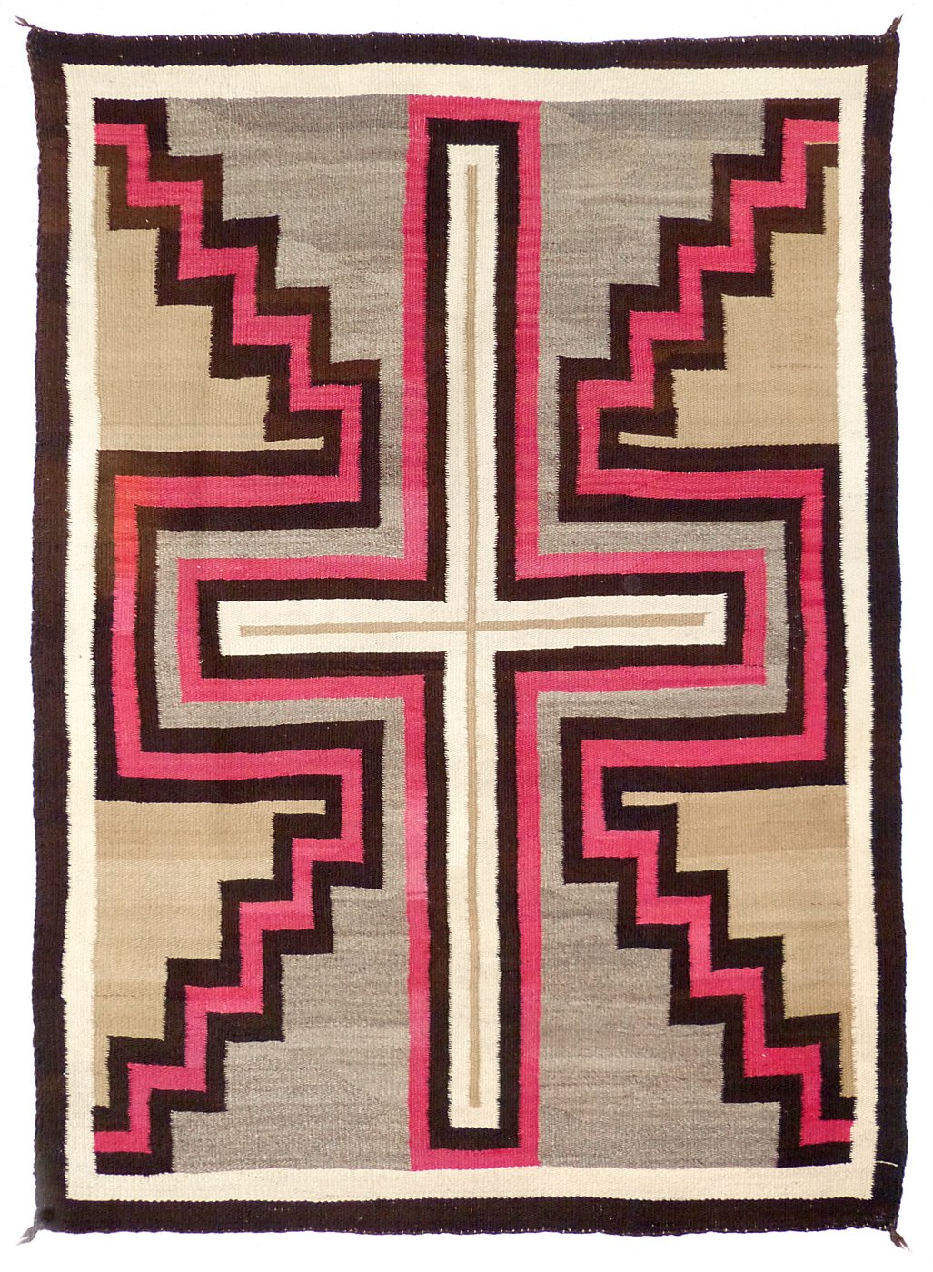 An early 20th century Navajo rug from the Ganado region woven entirely in hand spun wool in natural ivory, dark brown, tan, gray, and aniline dyed red. The design features a large thin cross motif in ivory with a red and brown border at center on a variegated gray background. The central cross is framed by stepped bands of red and dark brown along either side, radiating towards each corner on a background of variegated tan. The rug is further bordered by a band of ivory and dark brown along the outer edge.