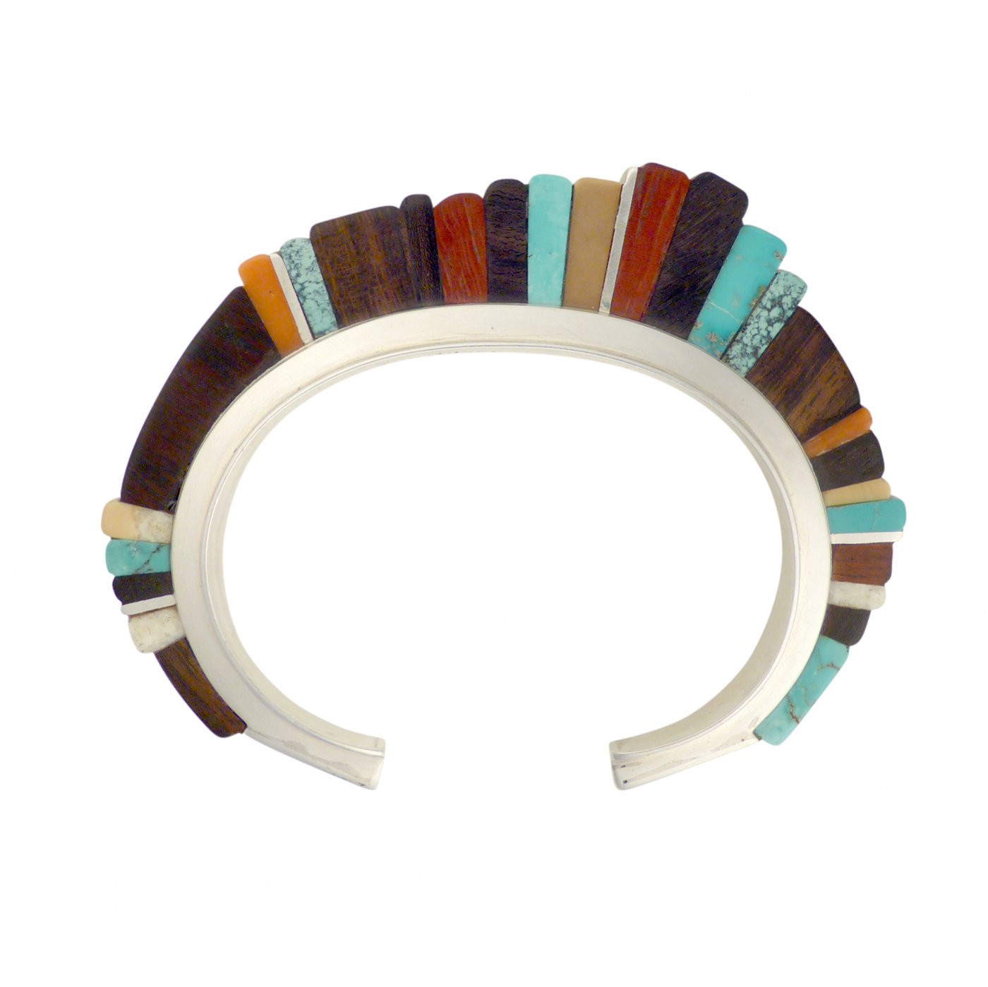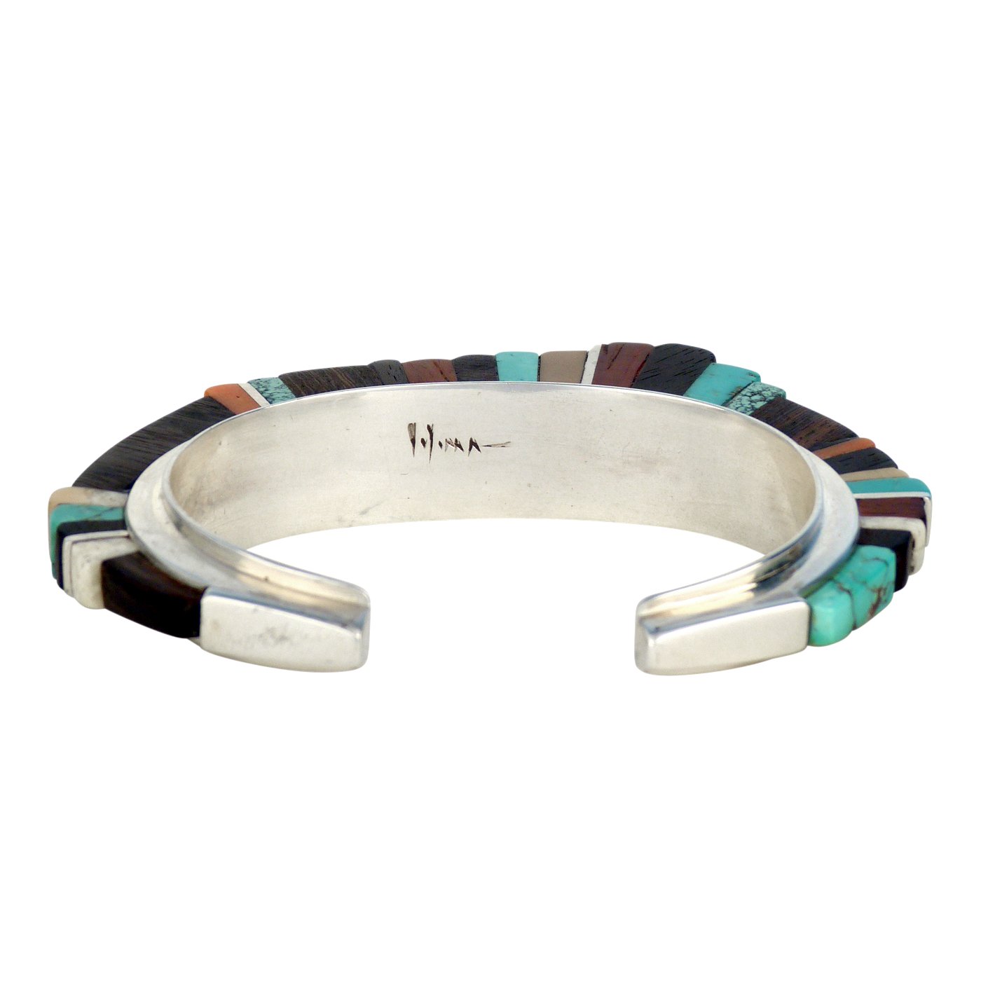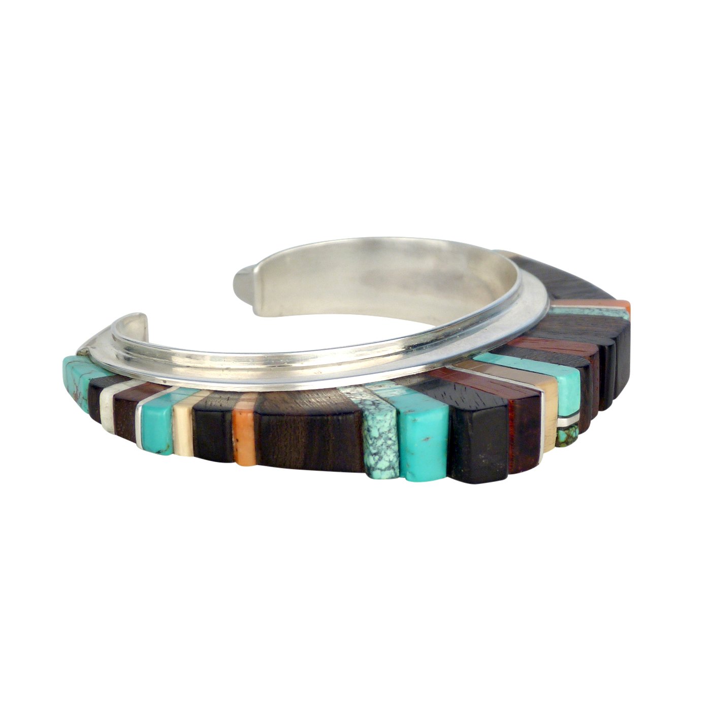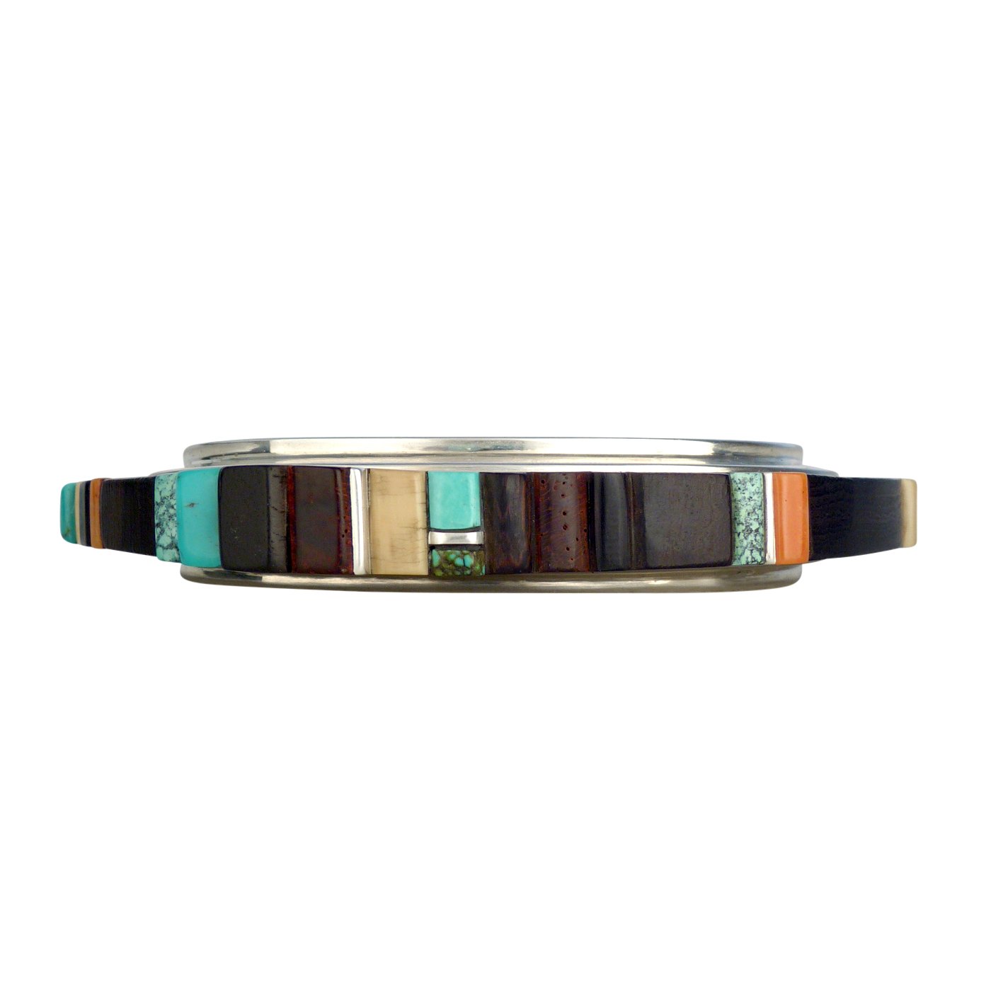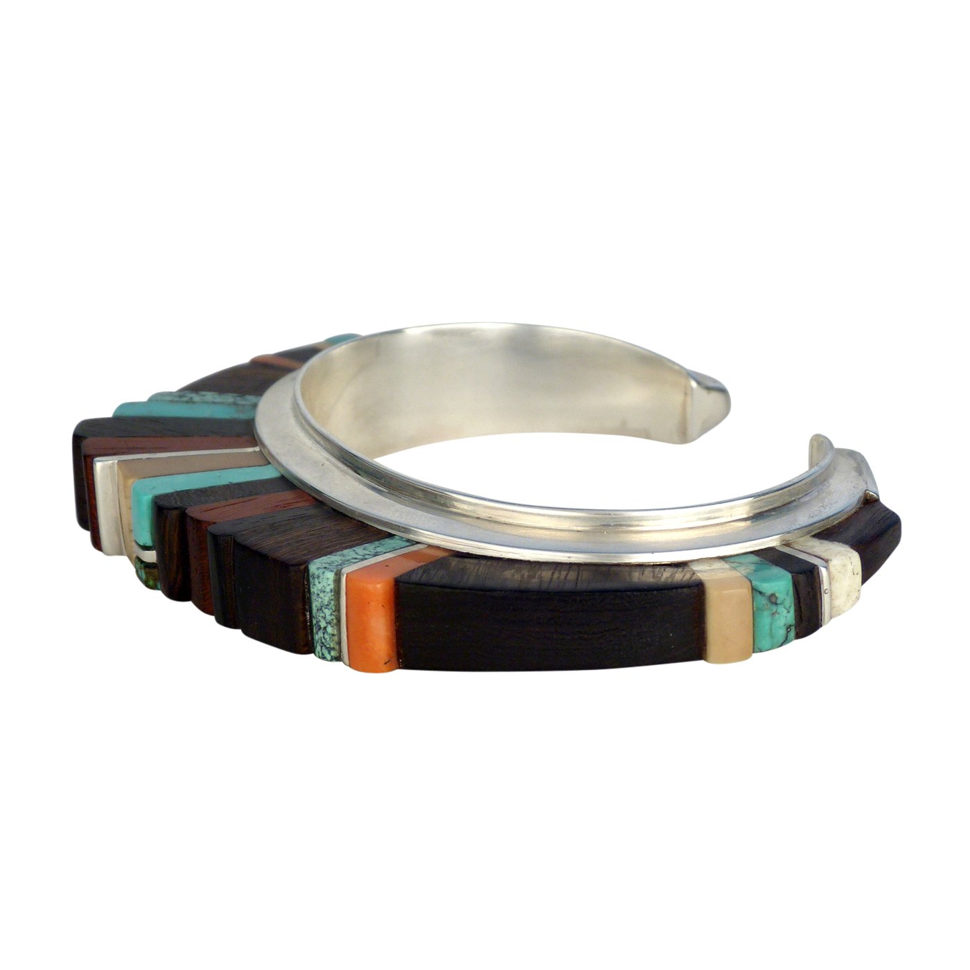 Charles Loloma, Hopi Silver Bracelet with Ebony, Coral, Fossilized Ivory and Turquoise Height Inlay, c.1970