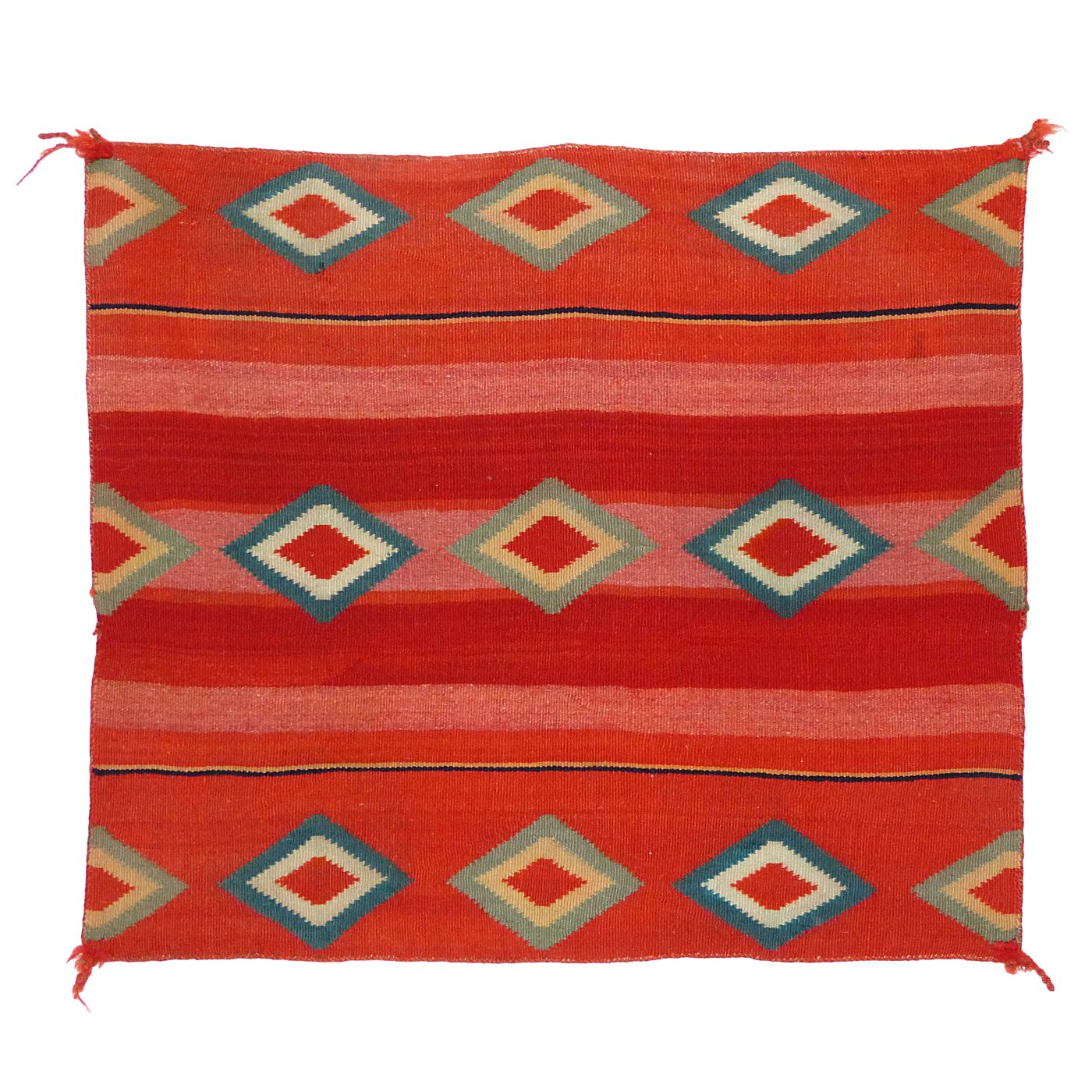 A late 19th century Navajo single saddle blanket woven in hand spun indigo blue, aniline dyed red and plied green, yellow, red, turquoise, mint and peach yarns. The design features three horizontal rows of diamonds comprised of small bands in alternating colors across center, top and bottom on a background of horizontal bands in various widths and hues of red.