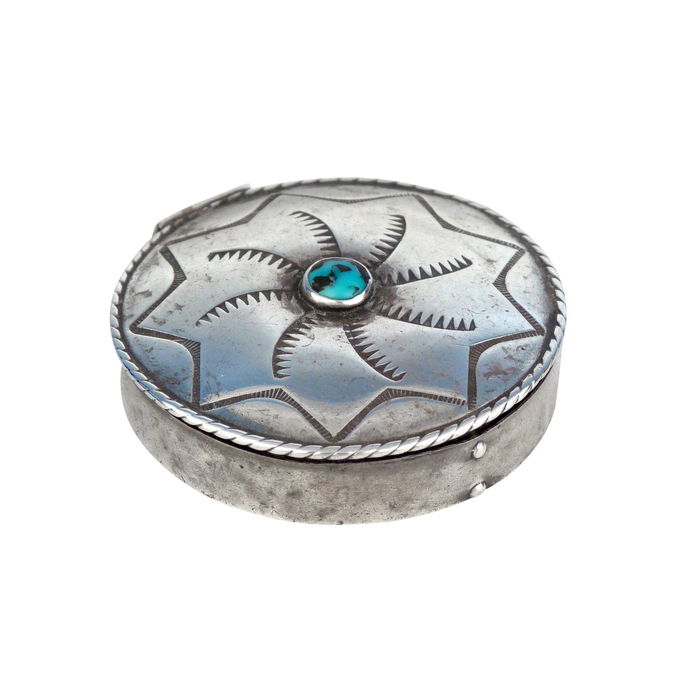 Navajo Stamped Silver Box with Turquoise Cabochon, c.1950