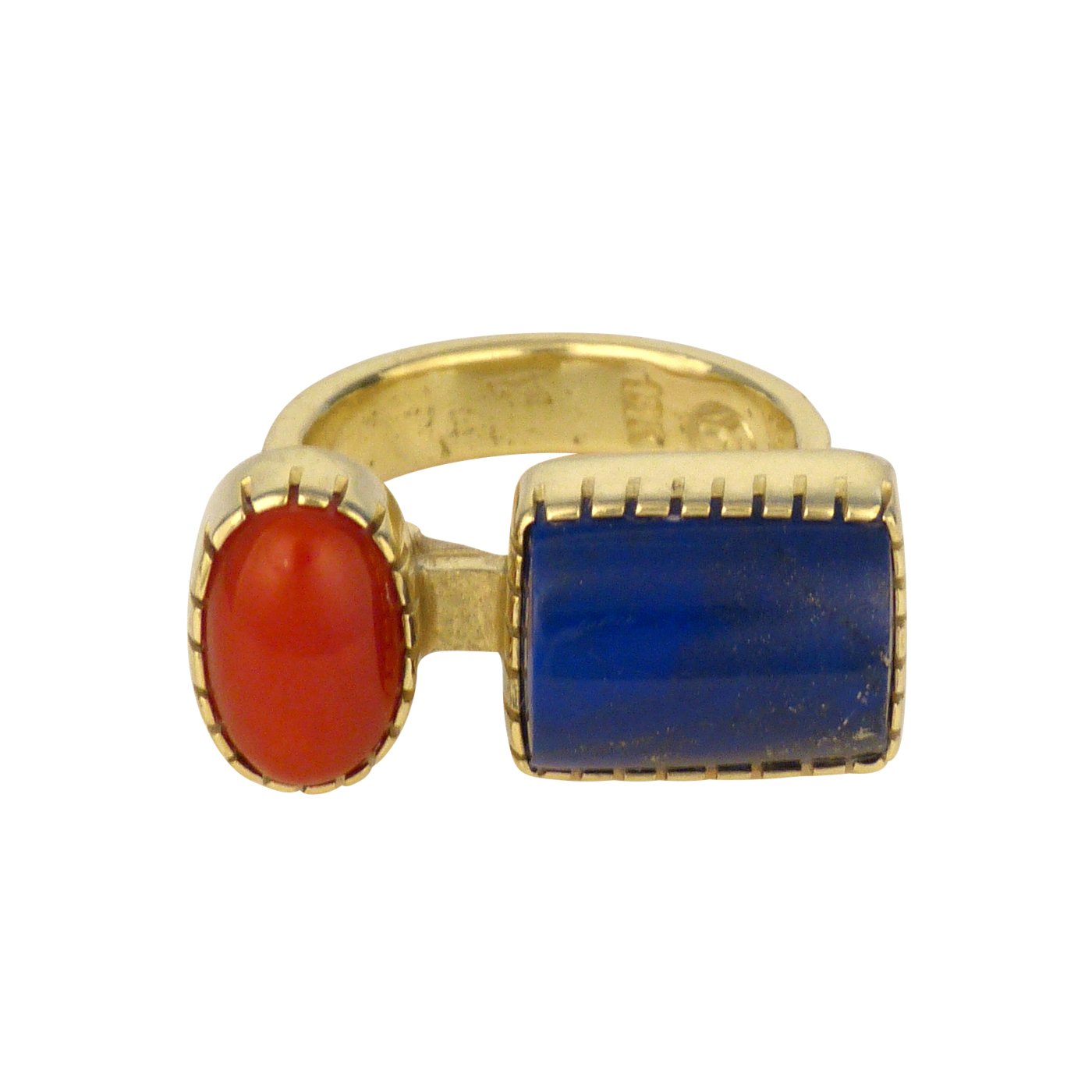Gail Bird and Yazzie Johnson, 18k Gold Ring with Coral and Lapis Cabochons