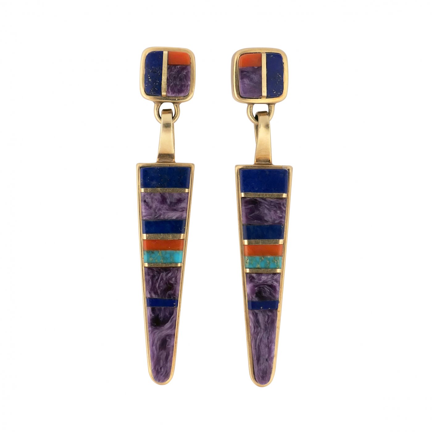 A pair of mid to late 20th century modern 14k gold earrings by Hopi artist Charles Loloma. Each earring is comprised of a square shaped stud earring with an elongated triangular dangle hanging from the underneath, all set with panels of stone to stone inlay in charoite, lapis lazuli, turquoise and coral with gold border accents between. The artist's hallmark is clearly visible on the reverse.
