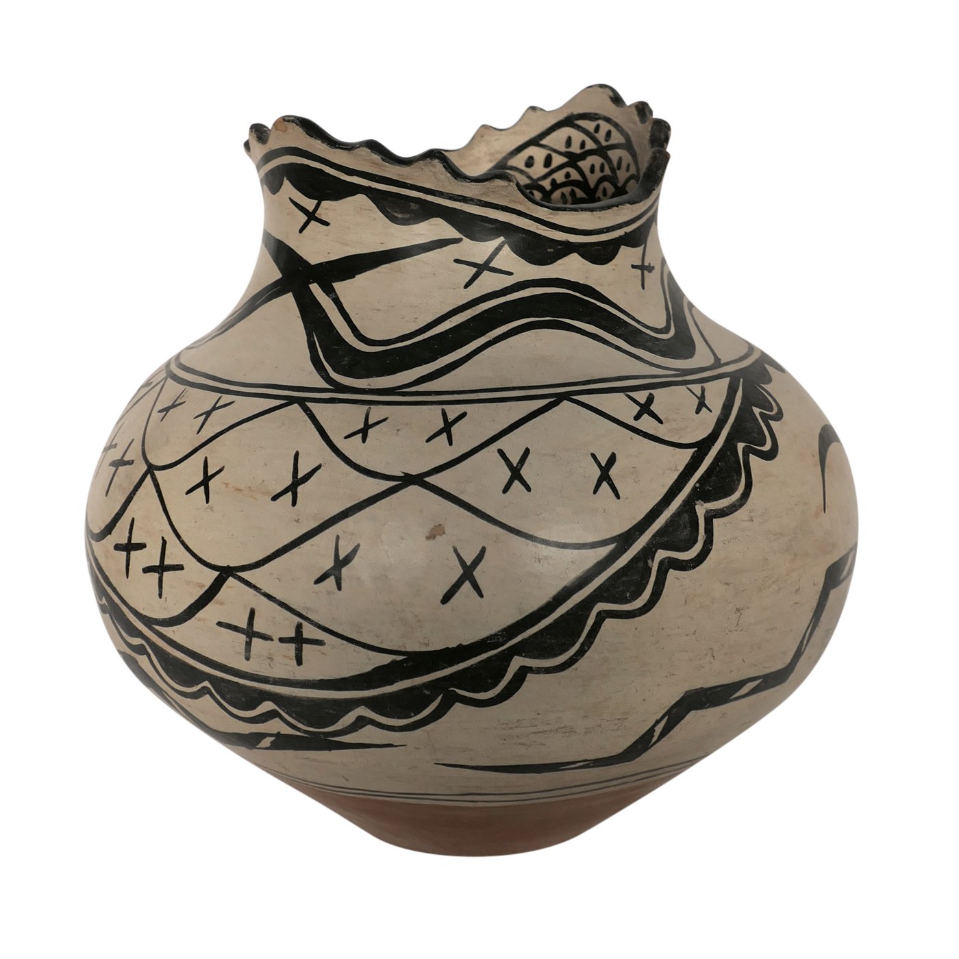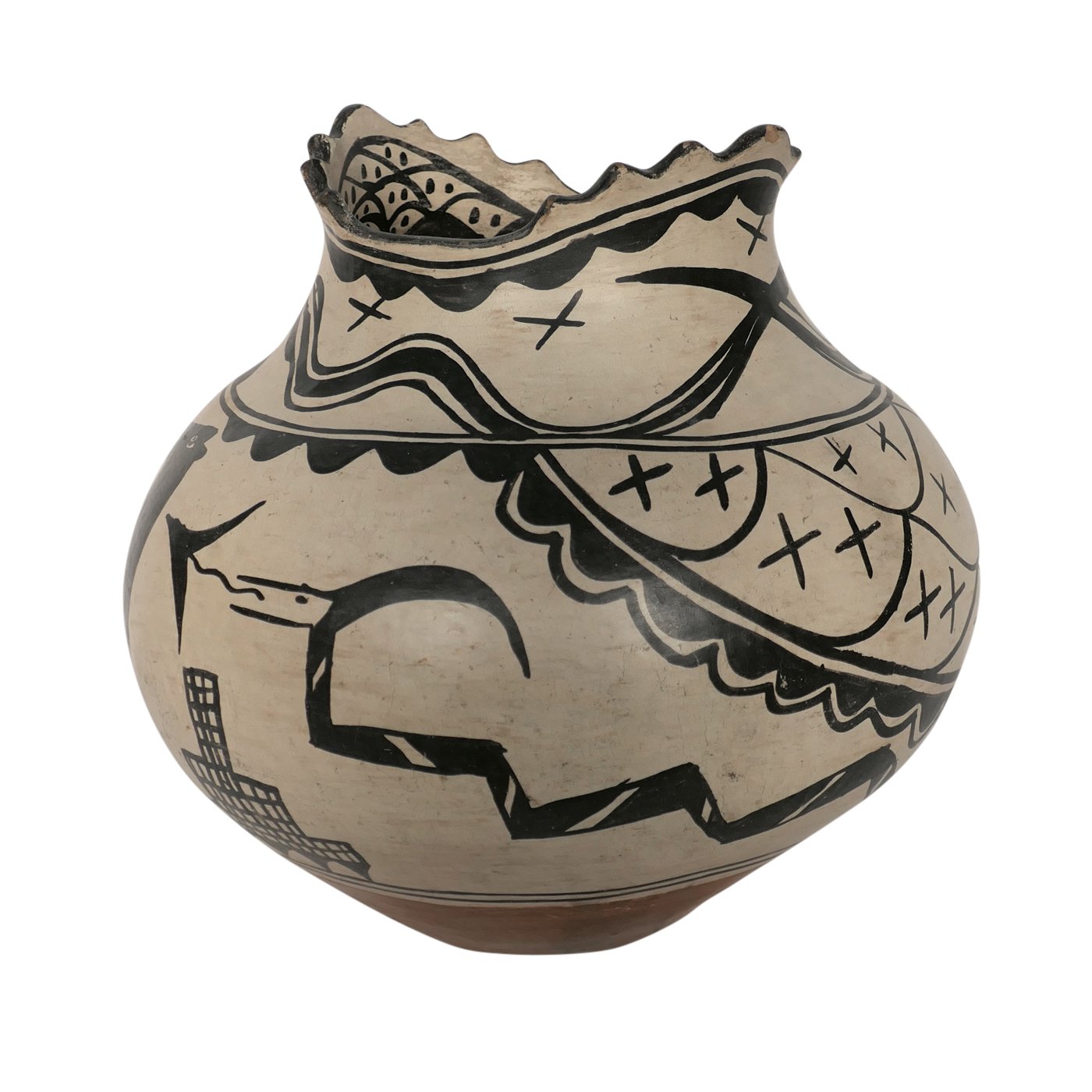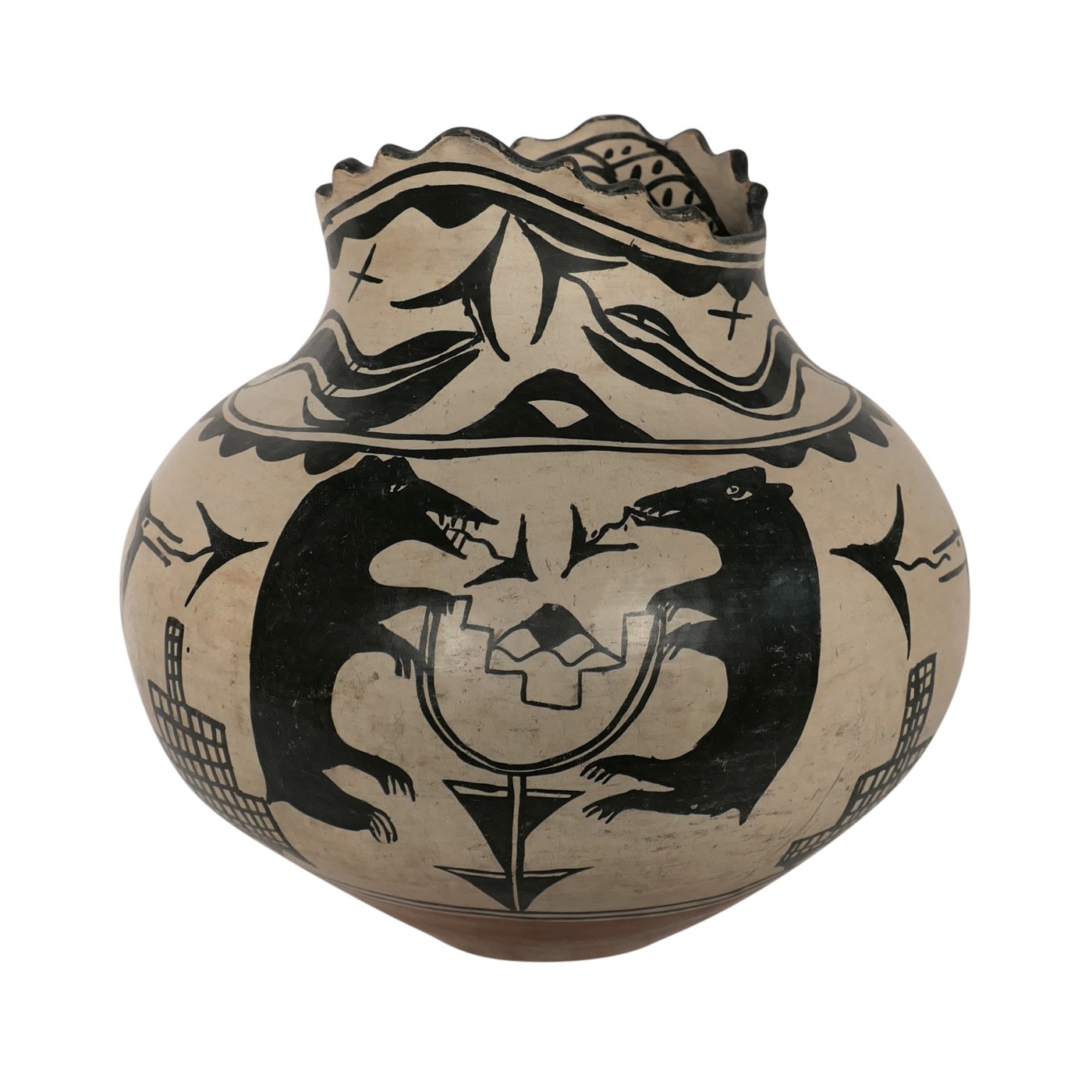 This is a late 19th century olla from Tesuque Pueblo with a terraced rim and figural painted design. In the mid body design band two bears with lightning projecting from the mouths are flanked by avanyus that face in the same direction. Stars float throughout the entire painted design and fill the space between the avanyu's tails. In the design band above the shoulders two very different serpents undulate around the jar and also have lightning coming from their mouths. Other designs included stepped and stacked clouds.