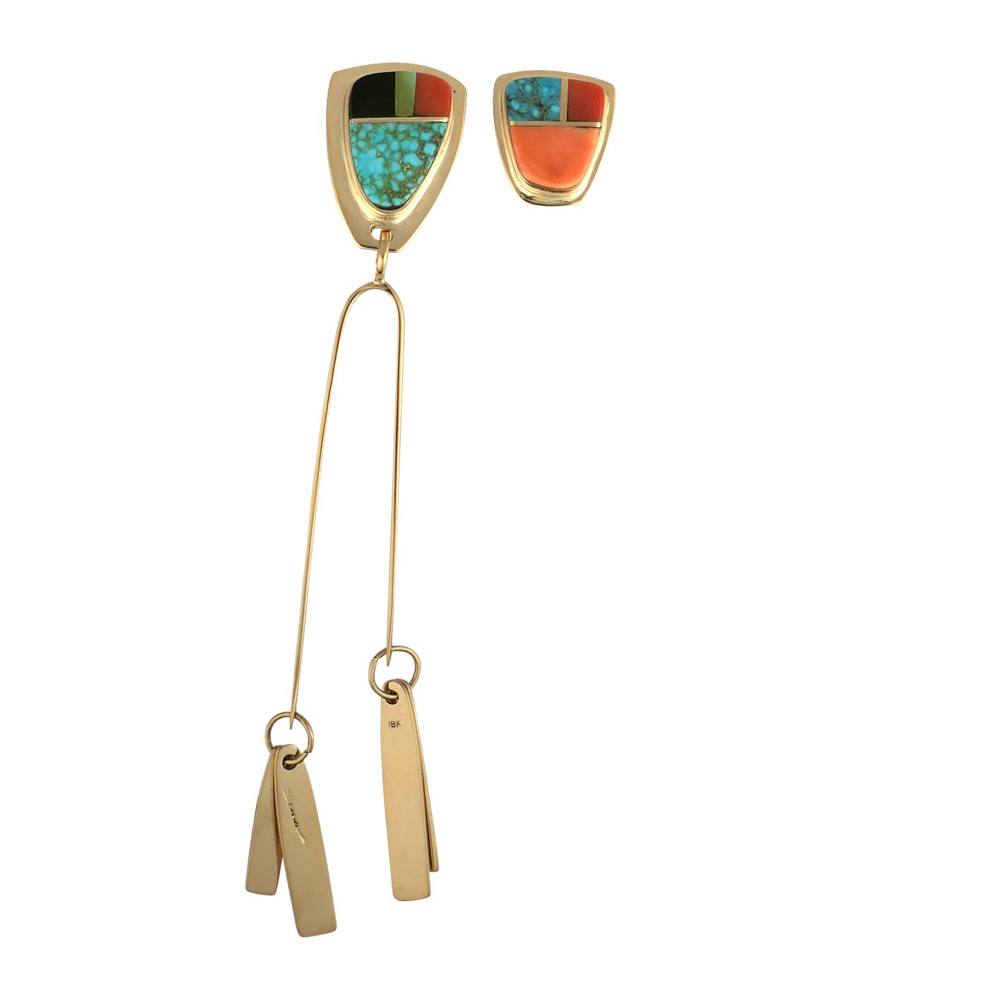 Sonwai, Hopi Asymmetrical 18k Gold Earrings with Inlay
